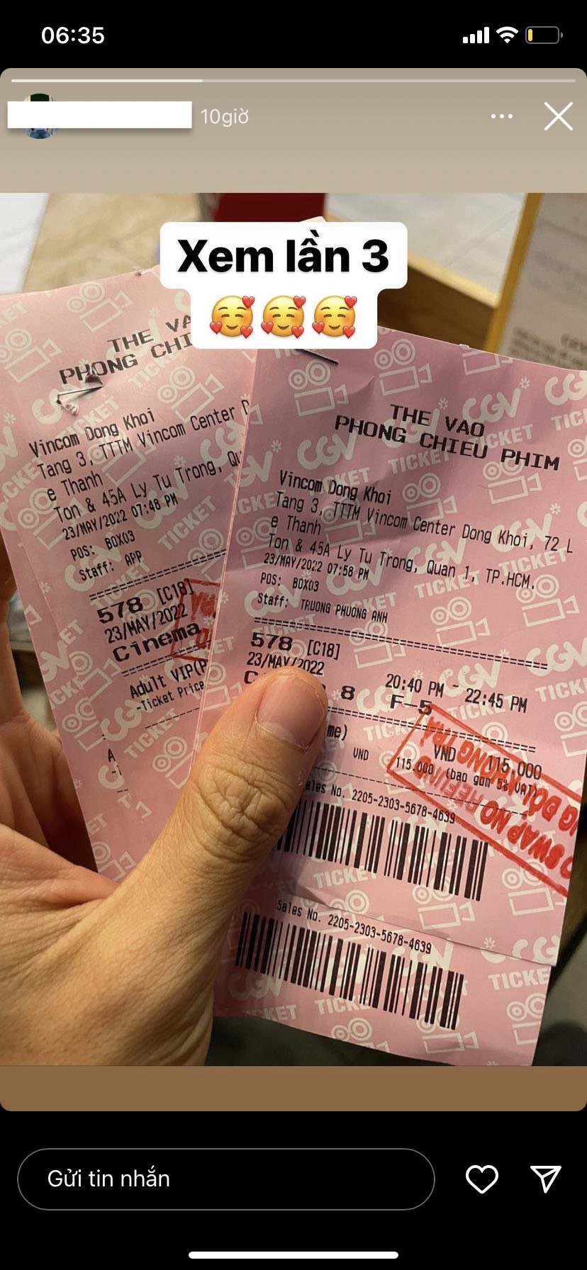 Mới đây, nhiếp ảnh gia T.K - "bạn trai tin đồn" của Hoa hậu H'Hen Niê chia sẻ trên story Instagram bức ảnh đi xem phim 578: Phát đạn của kẻ điên do H'Hen Niê đóng chính. Đáng nói, T.K tiết lộ đây là lần thứ 3 anh xem phim và đính kèm biểu tượng hình trái tim hạnh phúc.