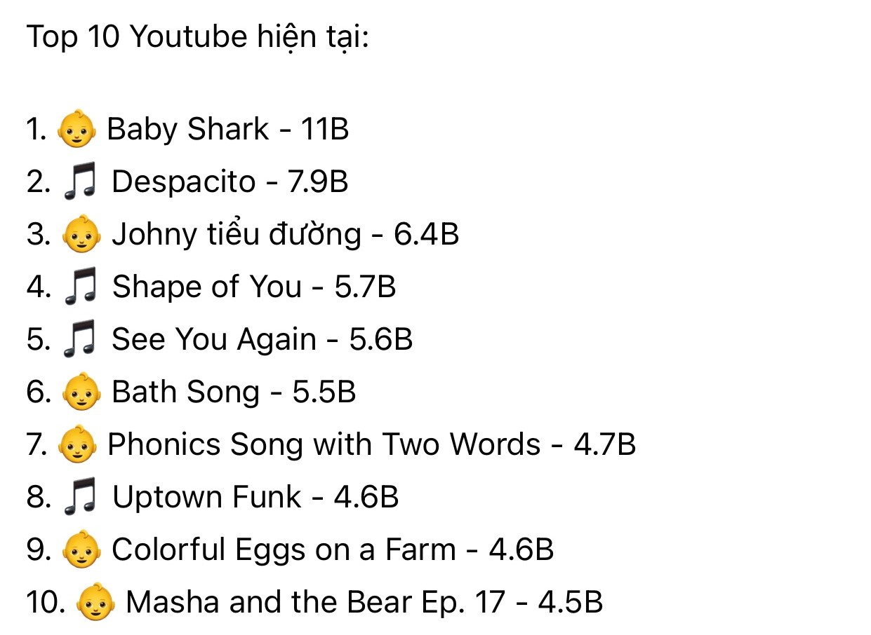 Cụ thể, Top 10 Youtube hiện tại như sau: