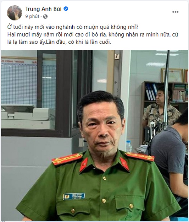 Trên trang cá nhân cách đây ít phút, nghệ sĩ Trung Anh hào hứng chia sẻ về dự án mới cùng cư dân mạng. Theo đó, sau hơn 20 năm gắn bó với bộ ria quen thuộc đây là lần đầu tiên ông hy sinh để đảm nhận nhân vật mới. "Ở tuổi này mới vào ngành có muộn quá không nhỉ? Hai mươi mấy năm rồi mới cạo đi bộ ria, không nhận ra mình nữa, cứ là lạ làm sao ấy. Lần đầu, có khi là lần cuối", nam nghệ sĩ úp mở.