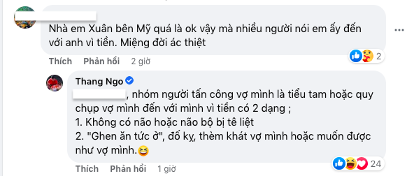 Đứng trước lời bình này, nam doanh nhân sinh năm 1975 thẳng thừng nói: "Nhóm người tấn công vợ mình là tiểu tam hoặc quy chụp vợ mình đến với mình vì tiền có 2 dạng. 1 là không có não hoặc não bộ bị tê liệt. 2 là "ghen ăn tức ở", đố kỵ, thèm khát vợ mình hoặc muốn được như vợ mình".