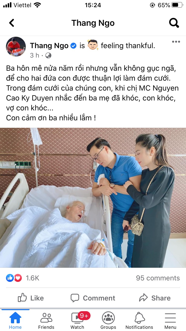 Khi mọi chuyện dần lắng xuống, đại gia U50 bất ngờ nhắc lại đám cưới gây xôn xao của mình. Theo đó, anh đăng tải hình ảnh cùng vợ tới thăm ba ruột. Kèm theo đó là dòng chú thích: "Ba hôn mê nửa năm rồi những vẫn không gục gã, để cho hai đứa con được thuận lợi làm đám cưới. Trong đám cưới của chúng con, khi chị MC Nguyễn Cao Kỳ Duyên nhắc đến ba, mẹ đã khóc, con khóc, vợ con khóc... Con cảm ơn ba nhiều lắm".